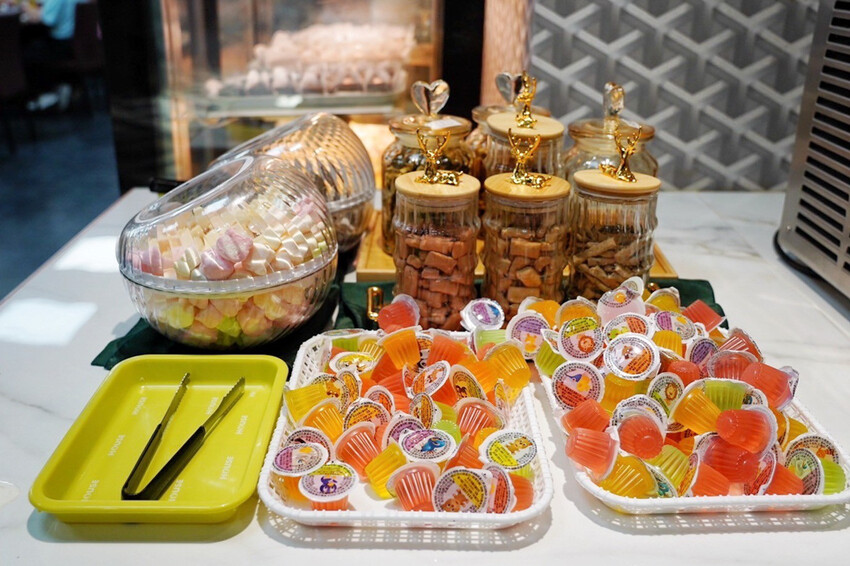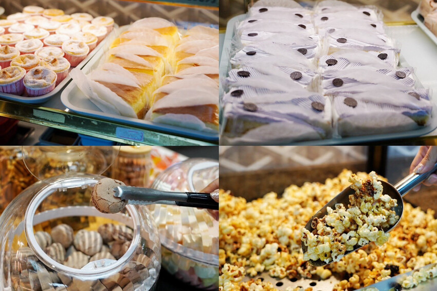 蛋糕甜區有常溫小零食,果凍、餅乾、棉花糖、台式馬卡龍與爆米花,冷藏櫃有中華豆花、愛玉、迷你布丁、波士頓派、杯子蛋糕、咖啡蛋糕、香芋蛋糕。