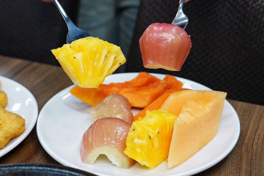 飯後還有蛋糕甜點、時令水果可選!小孩才做選擇我們都拿,水果可一次先拿一個,吃看看哪個比較甜就吃哪個,這天吃的鳳梨、蓮霧都挺甜~