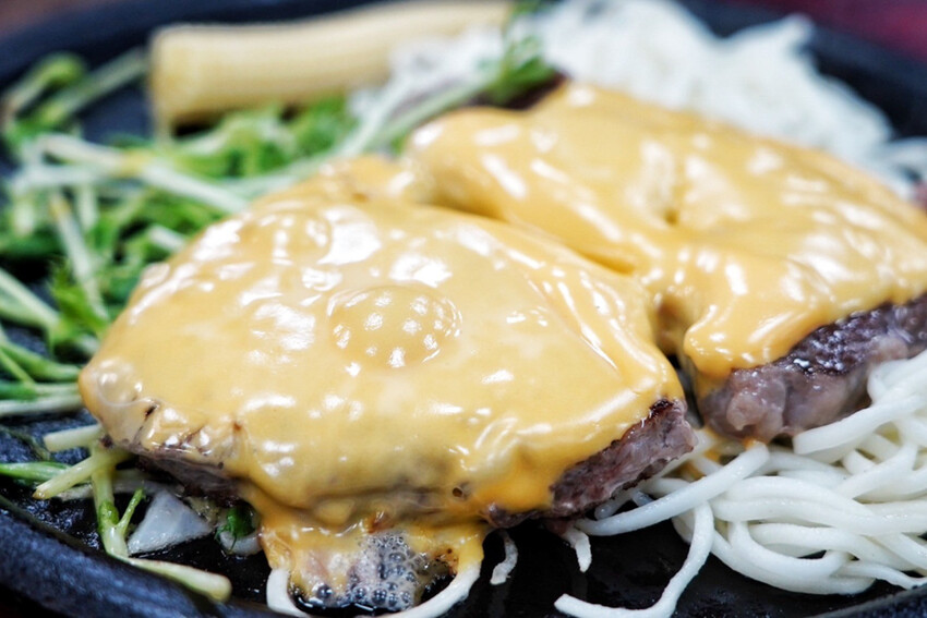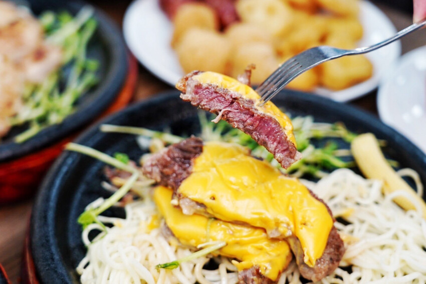 加購5盎司起司牛排只要69元!牛排鋪上起司片烤融化好邪惡,這一份69元底部還有鐵板麵,這應該是成本價吧!價格真的好便宜,底部鐵板麵份量只有幾口,不用擔心吃太飽,自助區醬料淋下去就對了~