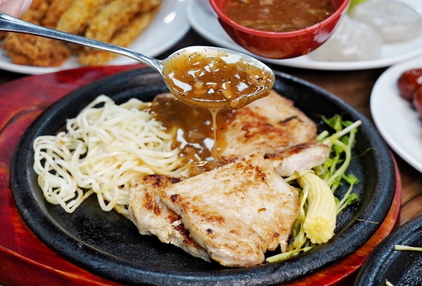 豬排只要加49元!豬排需要全熟,建議要趁熱吃,豬排沒讓人害怕的豬腥味,冷掉吃豬排偏乾需要點嚼勁,淋上醬黑胡椒醬或蘑菇醬都適合,再來點辣椒醬更夠味~
