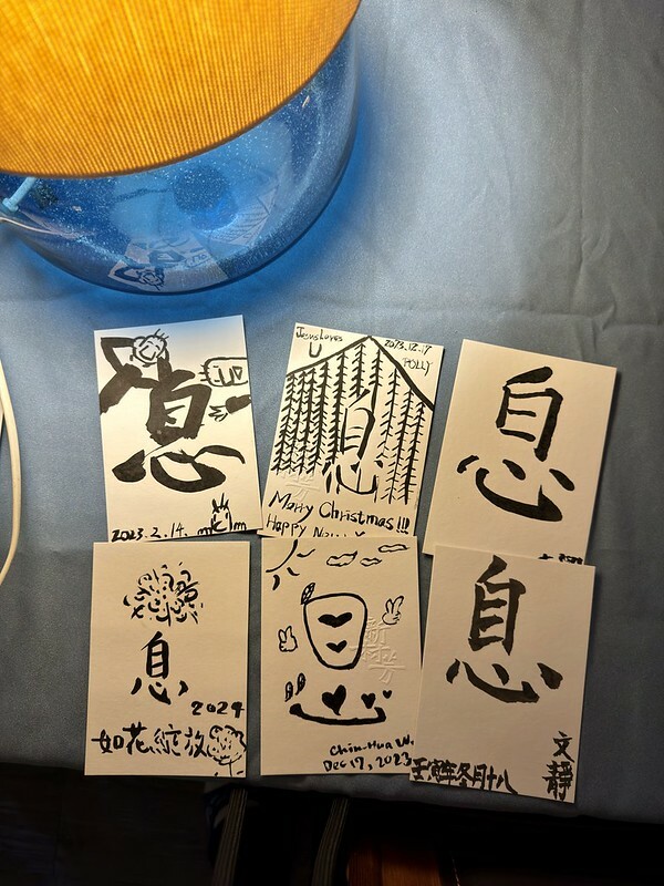 在書院裡可以看到明信片大小的白紙上寫了許多的「息」字,