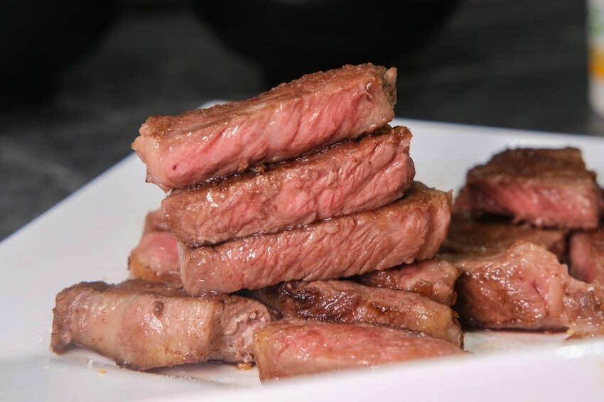 ▼呈現粉嫩色澤的蒜香牛小排,建議五分熟度剛剛好,肉質軟嫩帶點Q勁,濃郁的牛肉香在口中綻放,配上蒜片吃起來風味超讚!