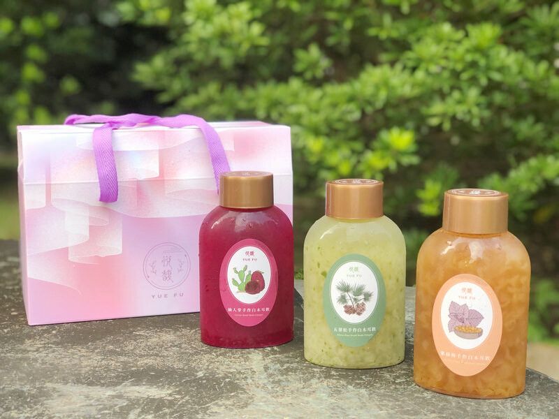 「悅馥手作白木耳專門」目前有九種口味可任意搭配成六入瓶裝組禮盒或九入袋裝組禮盒,適合節慶送禮餽贈親友的木耳飲健康飲品首選伴手禮。共享這份純天然、無添加又安心的白木耳飲禮物。