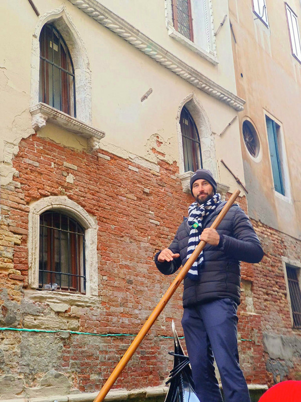 這是我們當天的船夫,跟一般的大叔不太一樣,放眼望去似乎他最帥,是不是跟基努李維有87分像🤭?技術高超的他除了用木槳撐船,還三不五時會用腳蹬一下牆面,讓貢多拉行駛得更加順暢;其實在我們去威尼斯的前幾天才看到大陸人搭貢多拉硬是不聽勸導,堅持要站起來自拍而不慎落水的新聞,所以我們在搭乘途中心裡也是七上八下,還好基努李維不僅會演戲,撐船功夫也是一流🤣