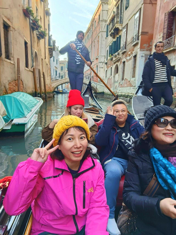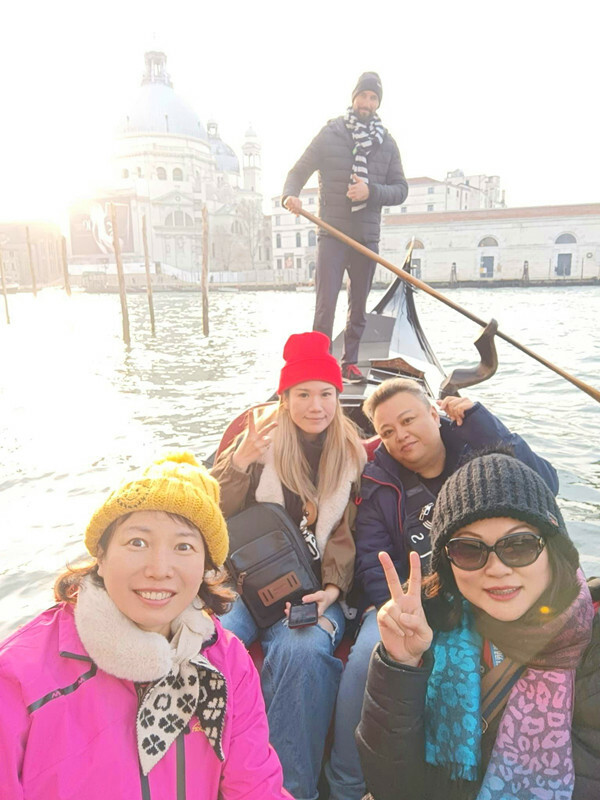 瞧瞧大家沐浴在夕陽餘暉中的開心表情,這種天氣在冬天的威尼斯可不是天天有!據說晚我們一天到的人,迎接他們的只有淒風苦雨,看來我們真是人品大爆發啊🥳!