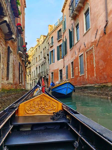 偶而遇到比較寬闊的河道還能二艘船並行,不論哪一國來的遊客,大家都會很興奮地跟擦身而過的船打招呼🙋♀️,貢多拉船夫的共同特色是黑白條紋的衣服,就算沒有穿也要搭配一條斑馬紋的圍巾以資識別