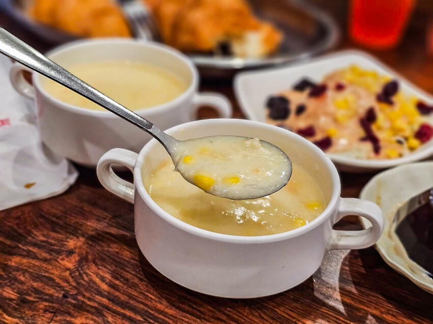 麵包很猛!直接給大可頌!剛烤好外層酥脆,裡面還有濕潤,而且不是很油膩很甜的那種可頌,應該是特製的,很多人都是麵包不吃帶回家,畢竟牛排份量真的很多,拿可頌沾玉米濃湯還不錯吃