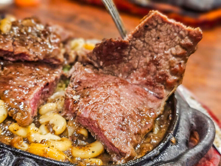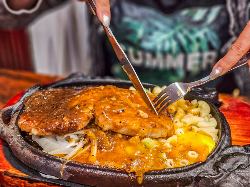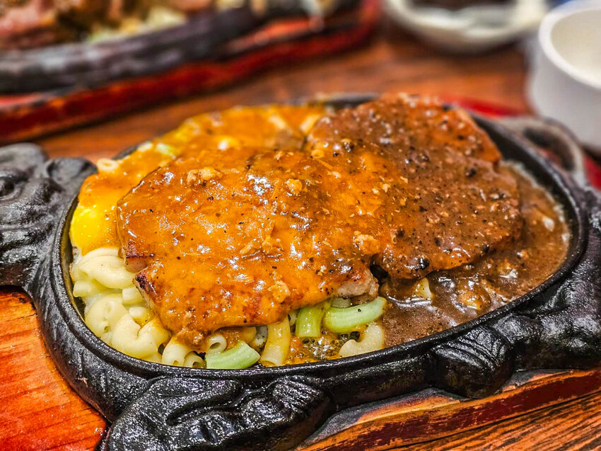 十盎司沙朗牛排,真的是有夠巨大!除了上面的牛排外,下面還有大量的鐵板麵(可選通心麵或是麵條)跟荷包蛋及蔬菜洋蔥,十盎司沙朗牛排大到鐵板放不下,索性就把牛排對折放在鐵盤上!所以看起來像是雙份肉但其實他是一塊肉