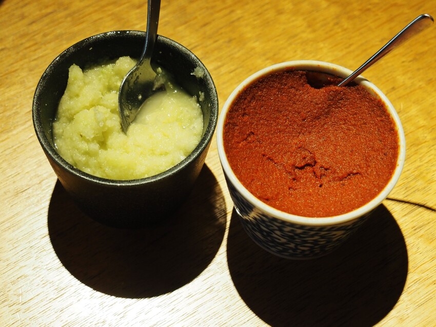 總共有三款豬排沾醬可以使用,桌上常態擺放著辛みそ(辣味噌)和わさびおろし(芥末蘿蔔泥),和定食一起盛盤的是帶點甘甜的生薑醬油。