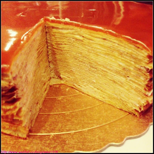 這次吃的口味是「焦糖千層」上面有厚厚的一層手工熬製的焦糖醬,一切開剖面圖感覺一層一層的好綿密~馬上好奇這到底有幾層,數了好久一時都忘了有幾層,只知道超過四十層有!要說多搞剛就有多搞剛~
