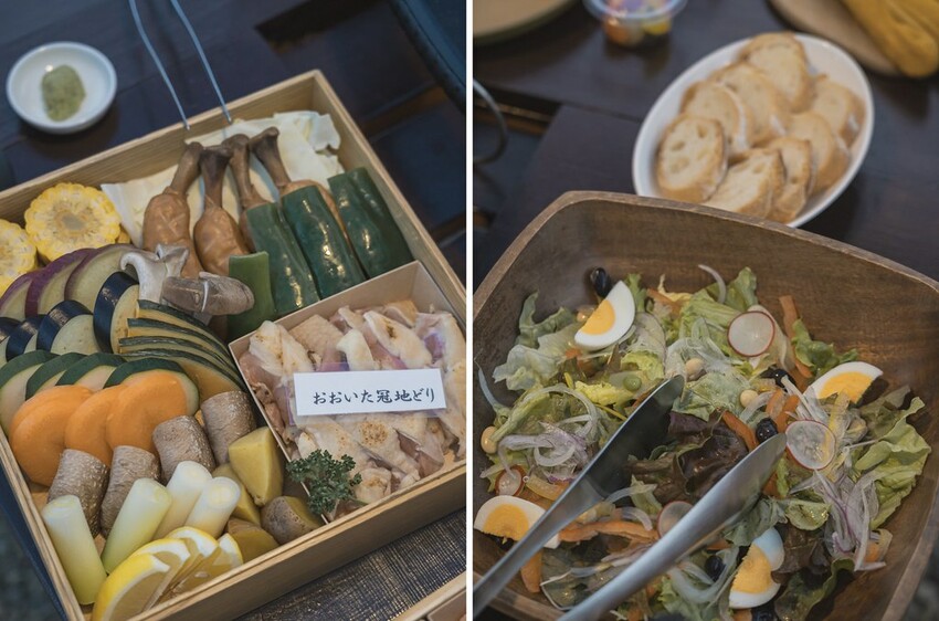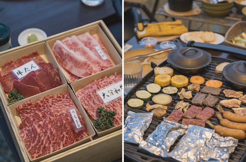 尚未入住前,本就很期待這份晚餐,畢竟使用大分縣產和牛、大分冠地雞及當地蔬果等當地高級食材,不僅現烤還可以搭配無敵山景,好不享受!晚餐的部分提供沙拉、濃湯、白飯、餐前麵包、蔬果盤及肉品盤及飯後甜點Haagen daz冰淇淋,實際品嚐後,肉質方面完全無可挑剔,和牛滋滋作響地在烤盤上炭烤,烤肉的香氣彌漫在空氣中,真是讓人食指大動,雖然整體而言份量已經算是充足,但肉品實在太好吃,立刻加點了一盤呢!