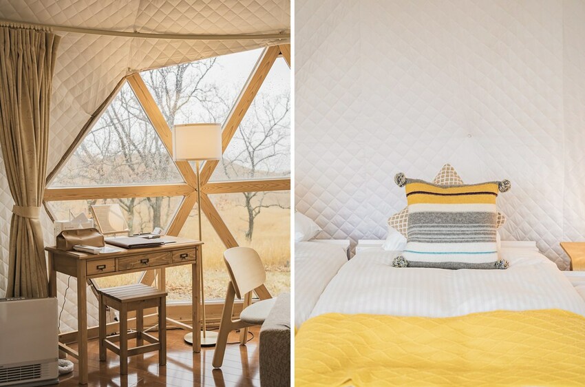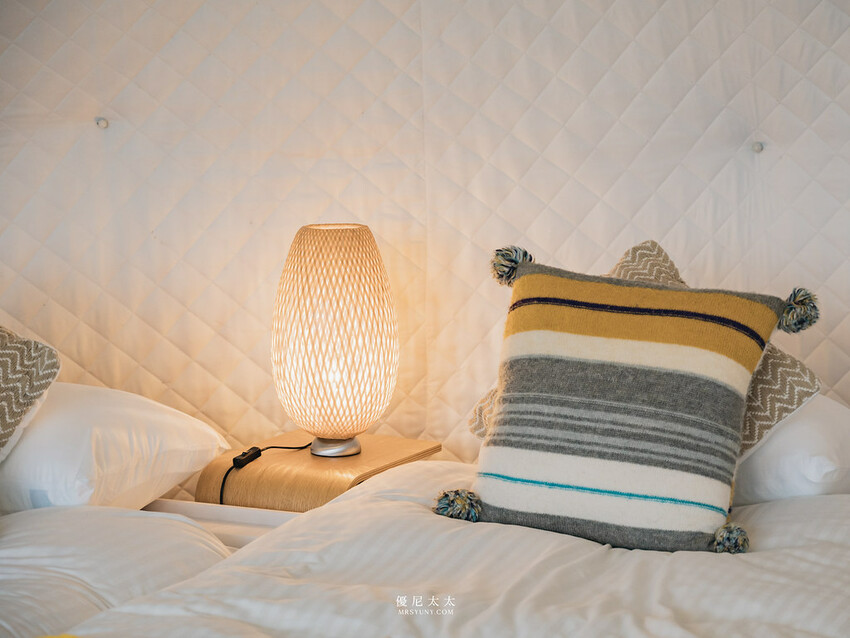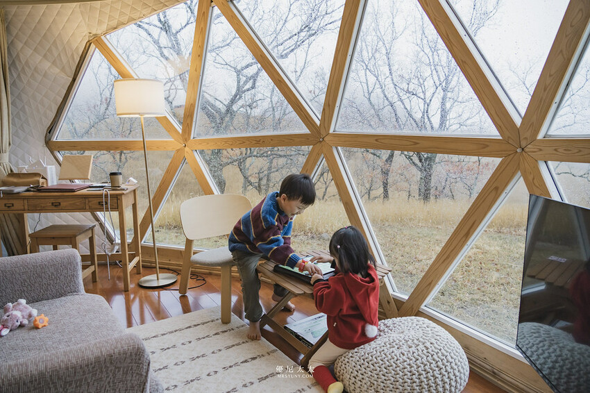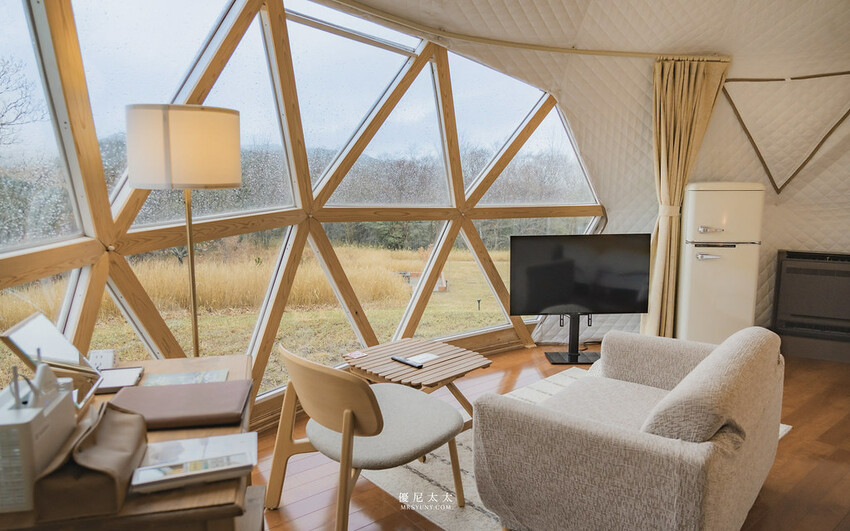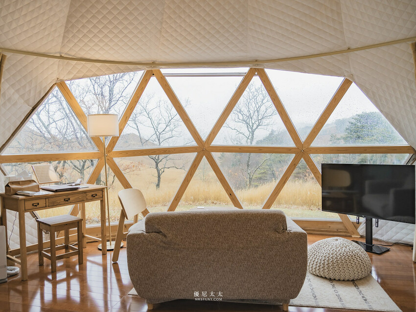 「GRAND VERDE RESORT」的露營區分為奢華露營區與一般露營區。這次的奢華露營區總共有15間圓頂帳篷,以北歐風格打造帳篷外觀以及內裝空間,走進便會讓人驚呼不已!暖色系的木質調家具及質木地板,坐在沙發上望出去的遼闊景色,還以為置身在歐洲呀。
