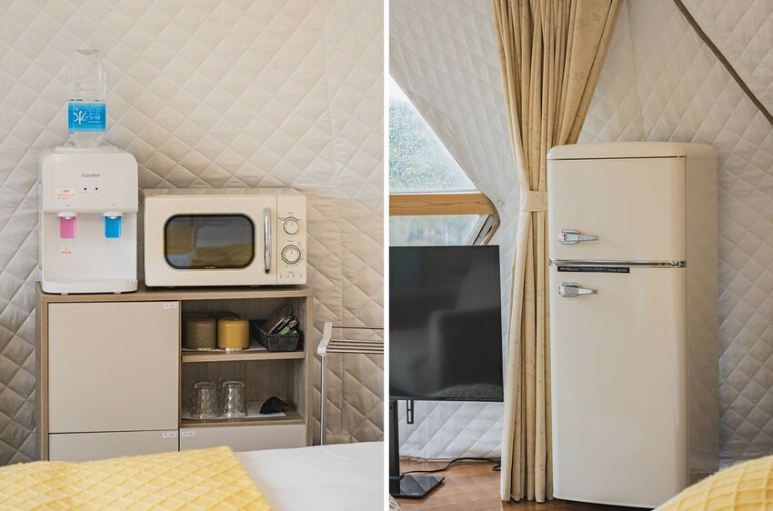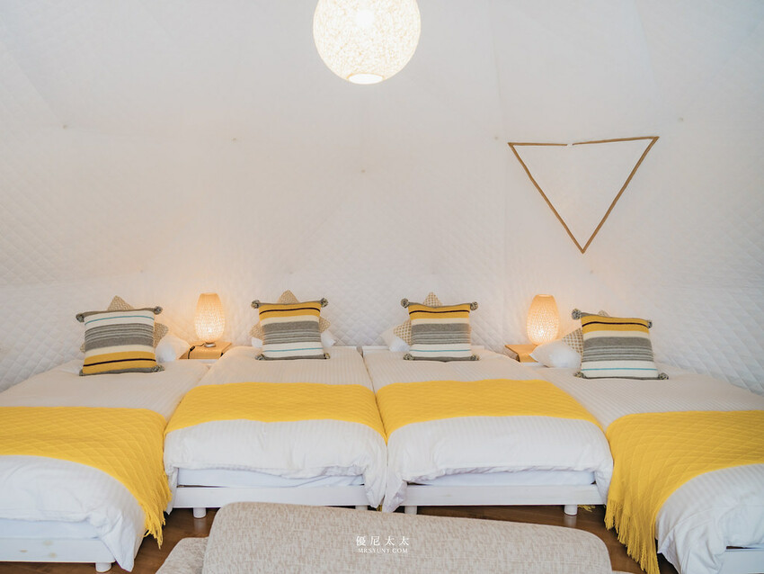 這個圓形帳篷真的太特別了!台灣很罕見的圓形帳,但在日本這個會下雪的國家可以體驗到。帳篷內部寬敞舒適,即便是多人入住也很舒適,這次入住的房型為『6m圓形帳篷四人房』,房內為四張單人床,帳篷外還有一個玻璃屋可以做烹飪,讓我們可以自己動手料理,感受到一種家的溫暖。(此次實際入住4大2小,空間上也很充足)