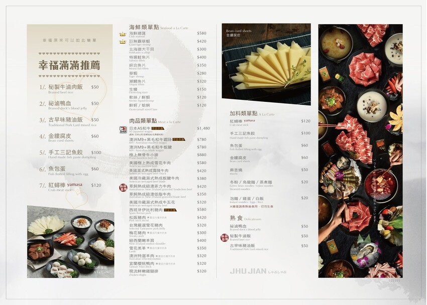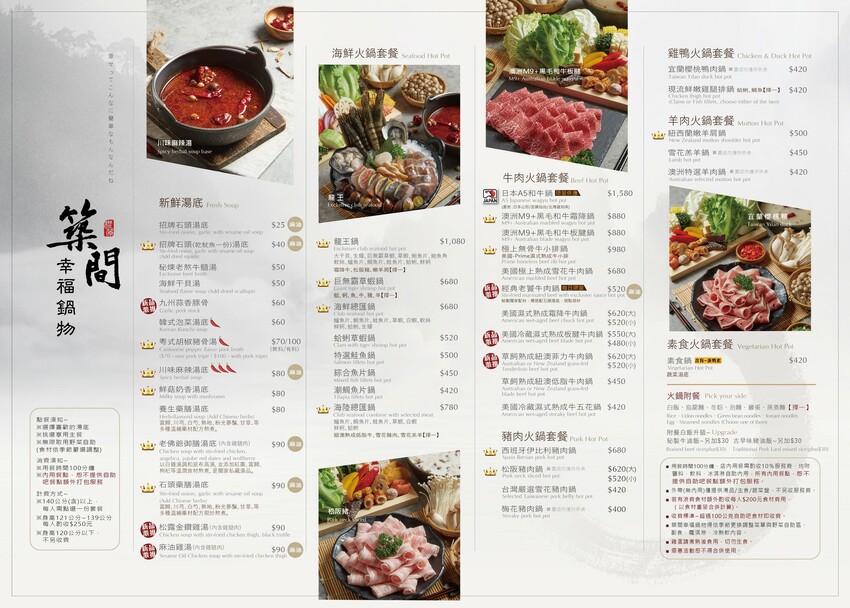 這裡提供築間幸福鍋物的菜單給你們參考,比較需要留意的是,築間目前有分為「一般門店」、「自助吧門店」與「火烤雙享門店」,菜單各有不同,其中「一般門店」是沒有自助吧的,套餐內會內附菜盤。