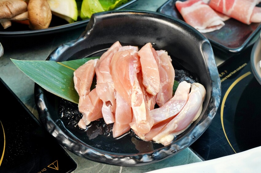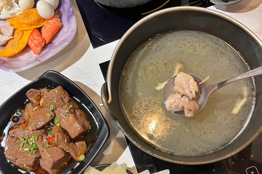 另一鍋柴魚昆布湯底搭配的是伊比利豬肉,大片肉質軟嫩好咬,搭配松露金鑽雞湯也好吃。