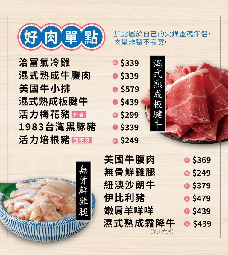 這裡提供肉多多火鍋的菜單給你們參考,目前平日午餐可享用3.5小時、宵夜時段可享用3小時,想開鍋也沒有時間壓力!