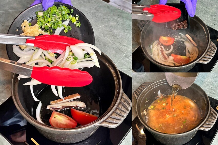 不敢吃辣的朋友選了爆炒招牌石頭湯,以多種蔬菜與海鮮調製的秘製石頭醬,搭配新鮮蔬果油爆爆炒,再倒入柴魚高湯,喝起來特別甘醇鮮美!