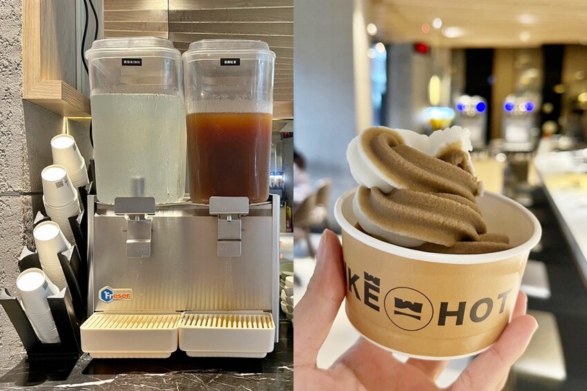 飯後當然也別忘了來杯飲料和甜點,飲料有咖啡機、金邊奶茶、蜜桃茶、汽泡飲料、紅茶花伝等可以取用。