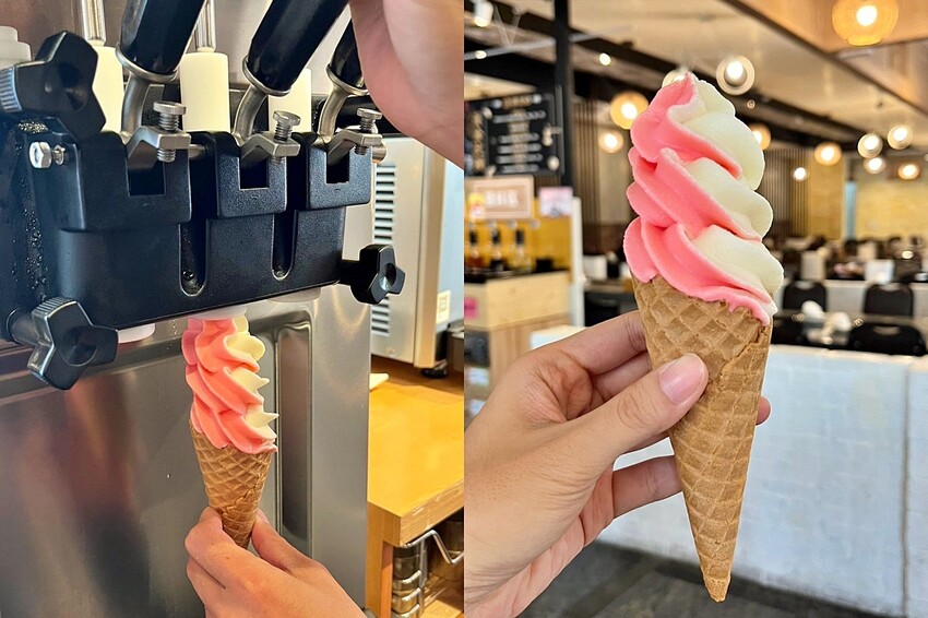 冰淇淋竟然有我們最愛的泰國明果冰淇淋!旁邊還有霜淇淋機台,這天供應的是草莓起司風味與北海道牛奶風味,綜合口味吃起來特別酸甜濃郁,我們直接連吃了兩支XD