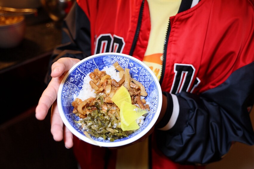 以肥瘦相間的五花肉切成長條,金黃誘人!球哥顧不得有那麼美食,第一道拿的就是這個滷肉飯。