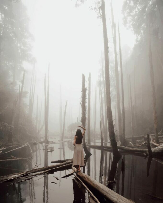忘憂森林位於杉林溪週邊,原本是一片生長著無數杉木的原始森林,在九二一大地震後,堵塞了河道形成一處沼澤,杉樹就這樣長期泡在水中,導致根部慢慢壞死,一棵棵筆直的樹幹佇立於此,沒有一點生機,水面倒映著枯樹與藍天,就像是身處末世一般蕭瑟冷清,讓人不經感嘆,雖然地震帶來毀壞,卻也造就出這番美景。