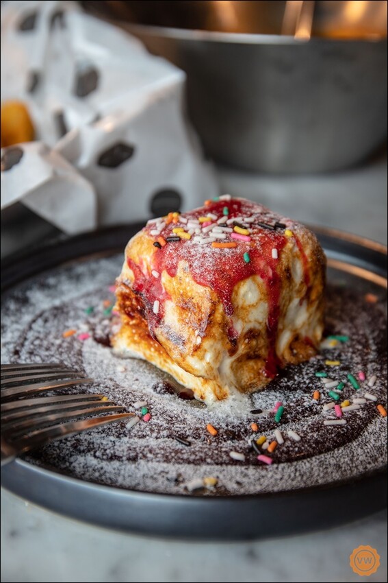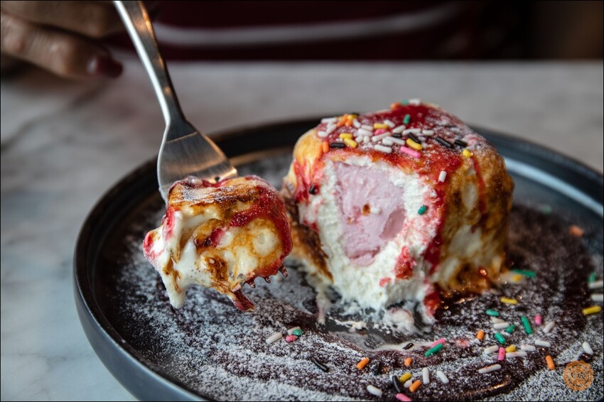 溫熱又軟綿的棉花糖,完整的包裹住草莓口味的冰淇淋,再搭配大量的彩色巧克力米,盤內還有草莓醬可供沾食,一勺入口後瞬間溶化的輕甜棉花糖,再加上沁涼的草莓冰淇淋,實在是很好吃!