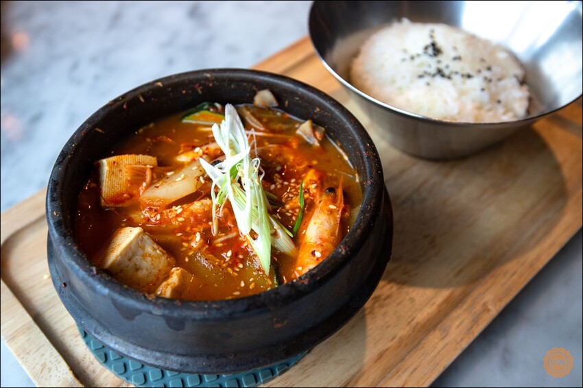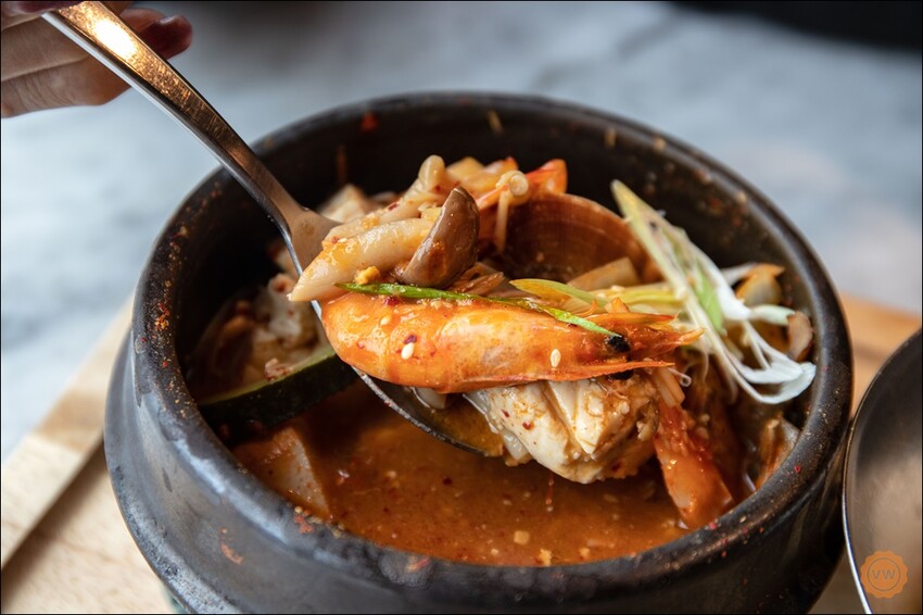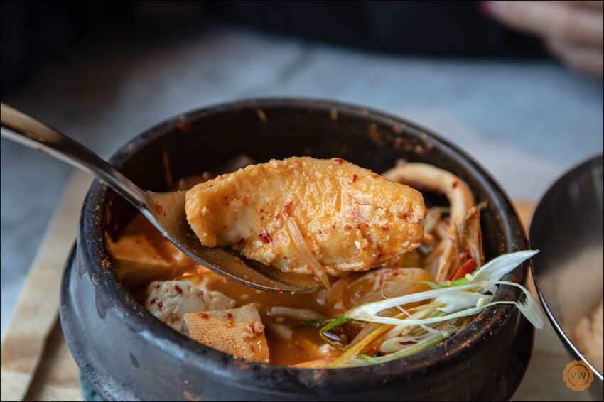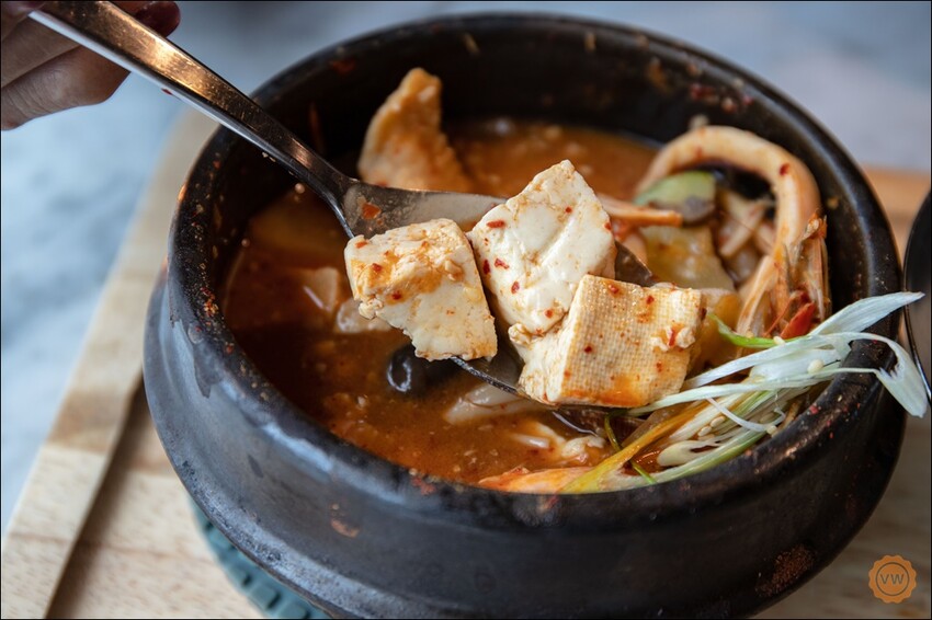 大醬鍋的調味相當適中不會過鹹,而且裡面除了基本的豆腐之外,加價選擇海鮮,則是會多了蝦子、中卷及去刺的魚塊,而且裡面還有多種蔬菜,用料相當豐富。