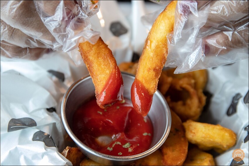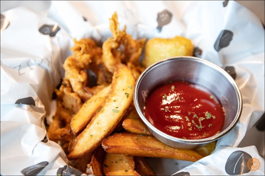 這道拼盤共包含了中卷、薯條及小雞塊,除了有灑上香料之外,還有附上蕃茄醬。
