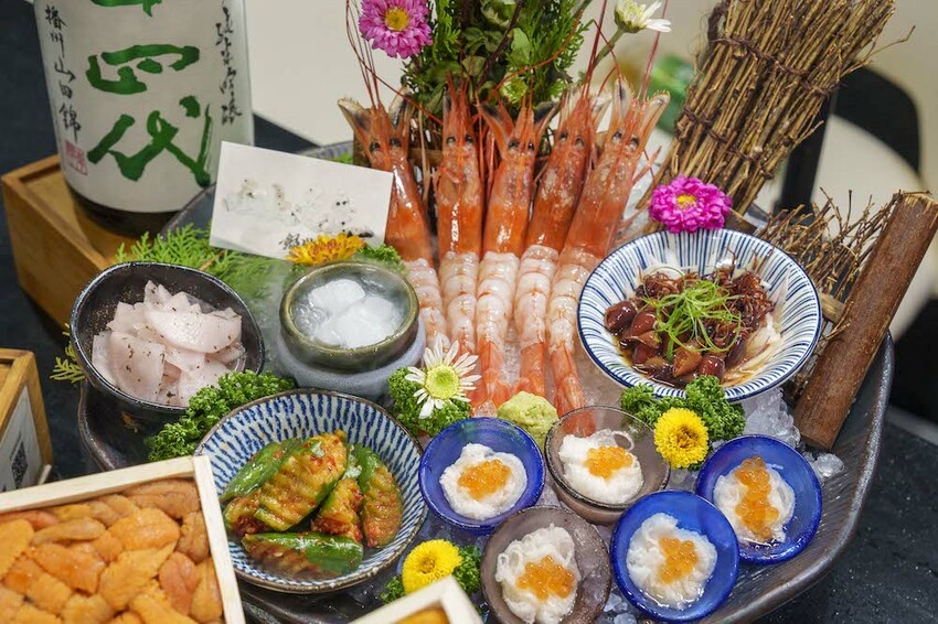 生食級海鮮冷盤包含天使紅蝦、山藥佐鮭魚卵、紫蘇醃蘿蔔等多種料理