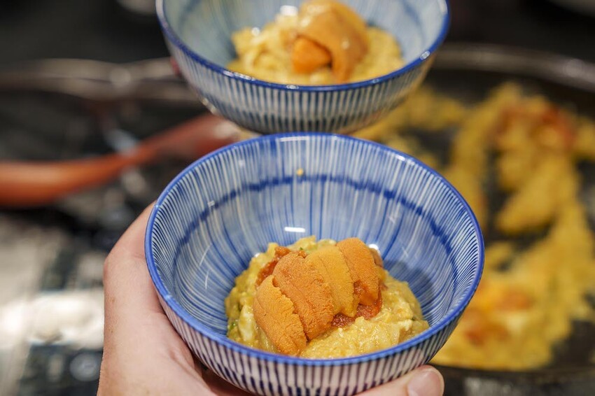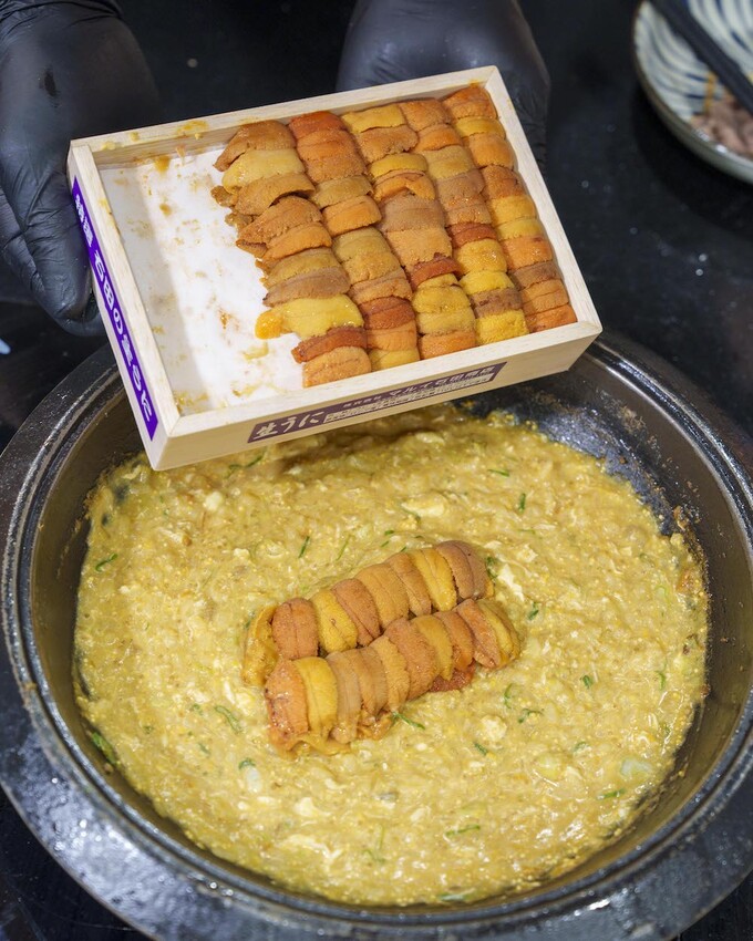 最後在集結所有食材精華的龍蝦湯中,加入蛋液、松露、飛魚卵等等佐料然後..然後再加上超奢華一整排的海膽