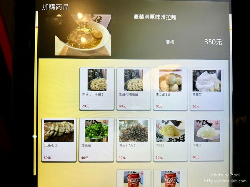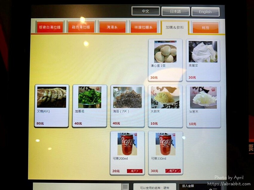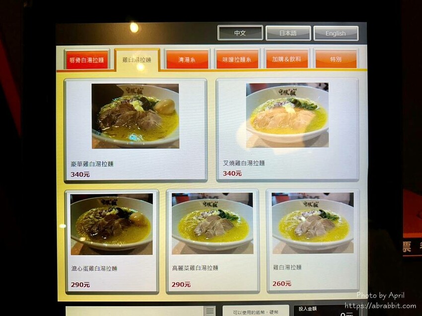 店內沒有紙本菜單,只有點餐機。點餐的方式就是直接到點餐機前面選,然後直接以現金付款!注意注意,只有現金,沒有刷卡喔。基本上湯頭大致就分為豚骨、雞白湯、味增三種,還有辣與不辣這樣。我們這次點了豪華濃厚味增拉麵、豪華雞白湯拉麵。