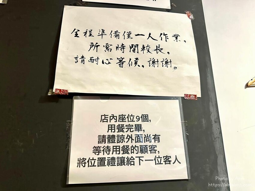 老闆話不多,一人廚房所以很認真的煮麵。店內的規矩都貼在牆壁上,入店內請認真看XD 基本上入內之後就是認真地等待,依序到點餐機前面選擇你想要吃的拉麵之後,再回到等待區的座位上等,「千萬不要看到有空的座位就興奮得坐上去」,等老闆整理好座位,會跟你收票卷、領你到你的座位區,接著等待他煮麵煮好!