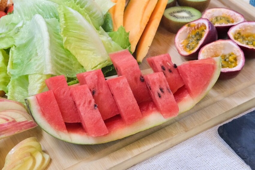 ▼豪華的蔬果大拼盤,包含柳橙、哈密瓜、百香果、奇異果、鳳梨、西瓜、生菜等,果肉都已事先處理好,只要負責大口享用就可以!