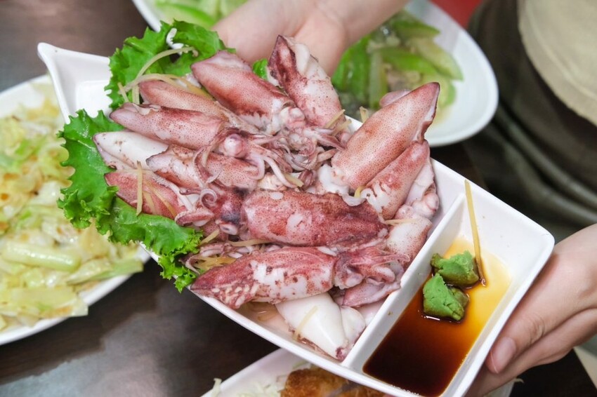 ▼來自澎湖新鮮直送的燙鮮小管,份量超霸氣給得像座小山,每一個都頭好壯壯又飽滿,趁熱咬下還會爆汁,不用額外沾醬就很鮮甜!