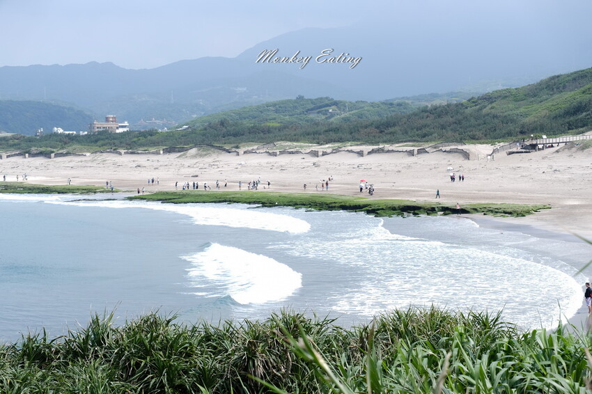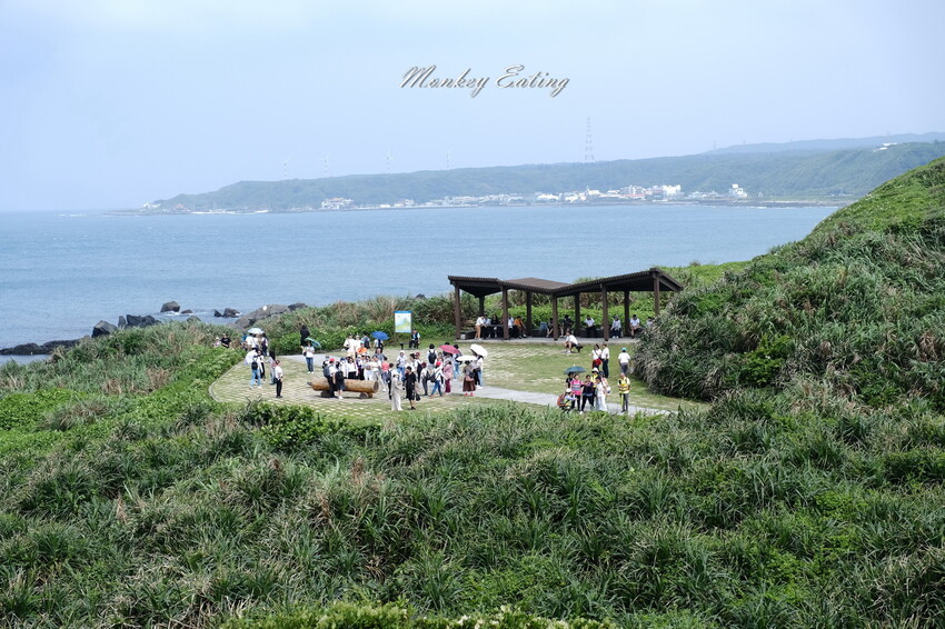 順著濱海步道來到老梅熱門景點,前方沙灘處聚集超多人