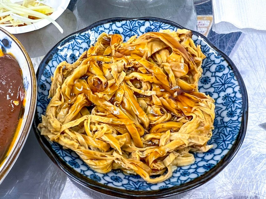豆皮切成長條並淋上醬油膏醬料,鮮嫩好吃,這道推薦