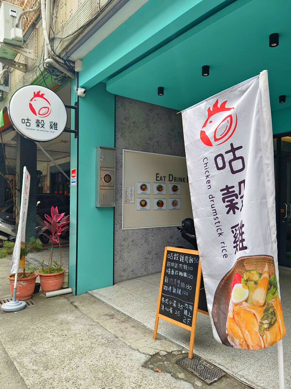 咕穀雞的logo是一個圓形的雞頭,招牌和外面的旗幟上都有,蒂芬妮綠的外觀也很搶眼,走在永興街上很難不多看它二眼