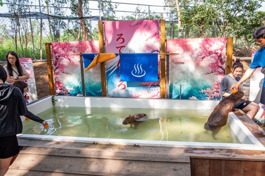 露天風呂區,這邊就是水豚君的家,天氣熱水豚都泡在水裡,也可以拿牧草餵他們吃,然後這裡的水豚還會頂橘子游泳,超可愛啦