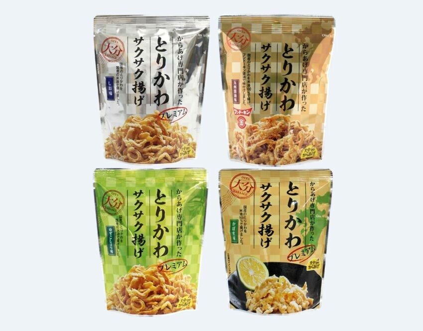 酥炸雞皮是大分的在地店家「大分からあげ」開發的點心,使用日本國產雞,及新鮮米油酥炸而成,有鹽味、醬油、大分柑橘(大分かぼす)、柚子胡椒等四種口味。鹽味襯托雞皮的香、醬油口味濃郁豐富、大分柑橘口味微酸清爽、柚子胡椒口味則是有著柚子的微酸清爽帶著唐辛子的辣勁。四種口味都難分難捨,不過小朋友才做選擇,通通都帶回家,才是最佳選擇。