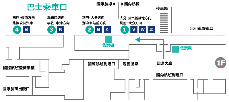 到大分機場之後,直接搭乘「巴士」到大分市區、別府車站、湯布院是最輕鬆的方法,也可以選擇租車或是搭30分鐘的計程車到JR杵筑站,再轉乘JR到大分站。