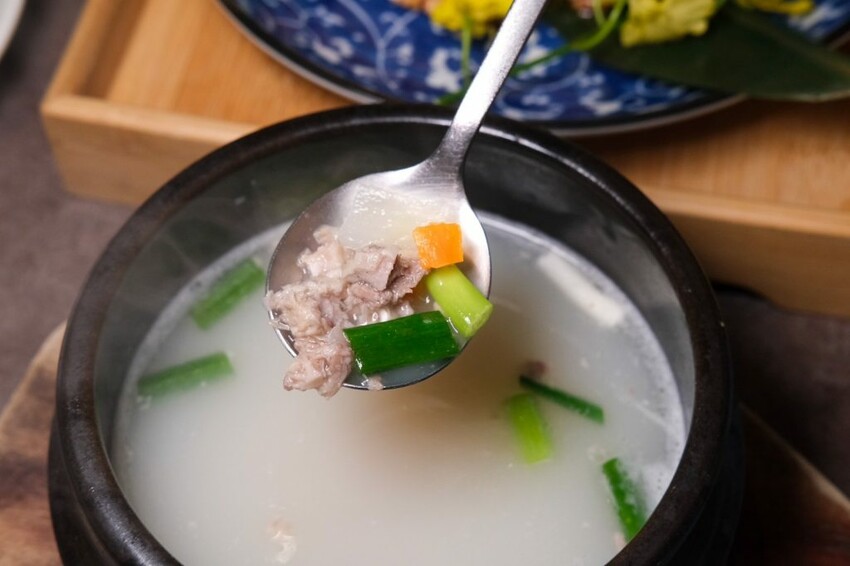 ▼醇厚又甘甜的主廚特製湯品,以大骨慢火熬煮成濃厚風味,裏頭還能撈到不少的肉塊,一上桌就瞬間被大家喝光光!