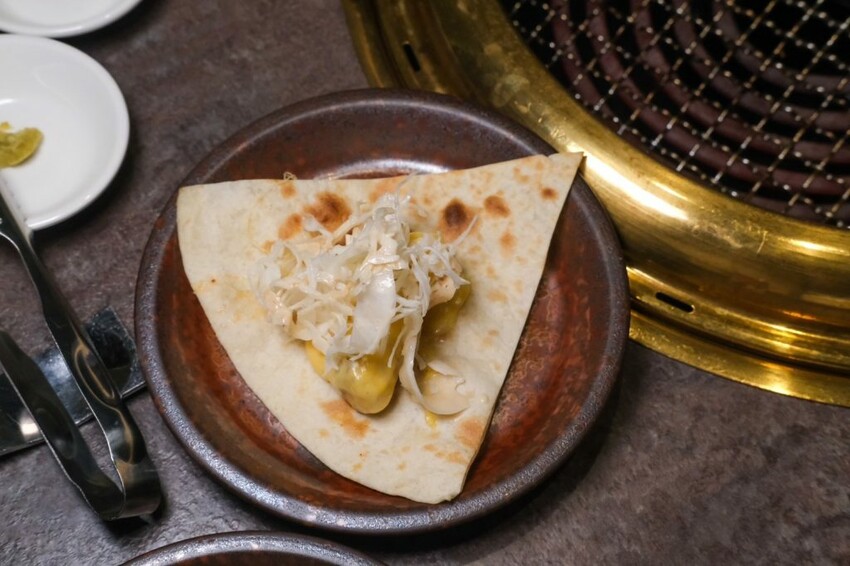 ▼燒肉的好朋友香濃起司和烤餅皮,加熱後呈現邪惡的牽絲效果,將酥脆的烤餅包著肉和起司,大口吃下實在太過癮啦~