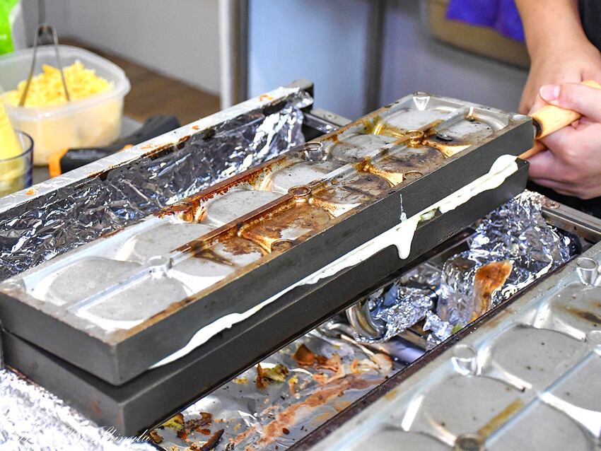 這跟我之前看到的雞蛋糕不一樣,擠上一整坨的粉漿,再入餡料,看老闆的製作過程超療癒der~