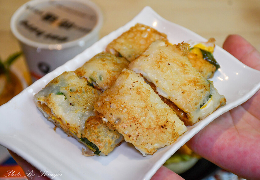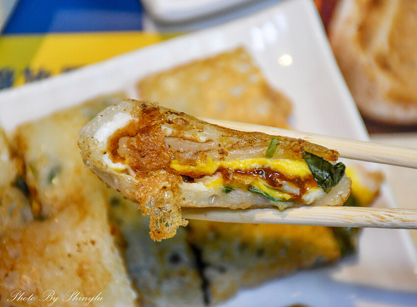 ↑九層塔粉漿蛋餅,也是店家招牌之一,餅皮跟一般蛋餅不同,它比較厚,沒有任何粉感