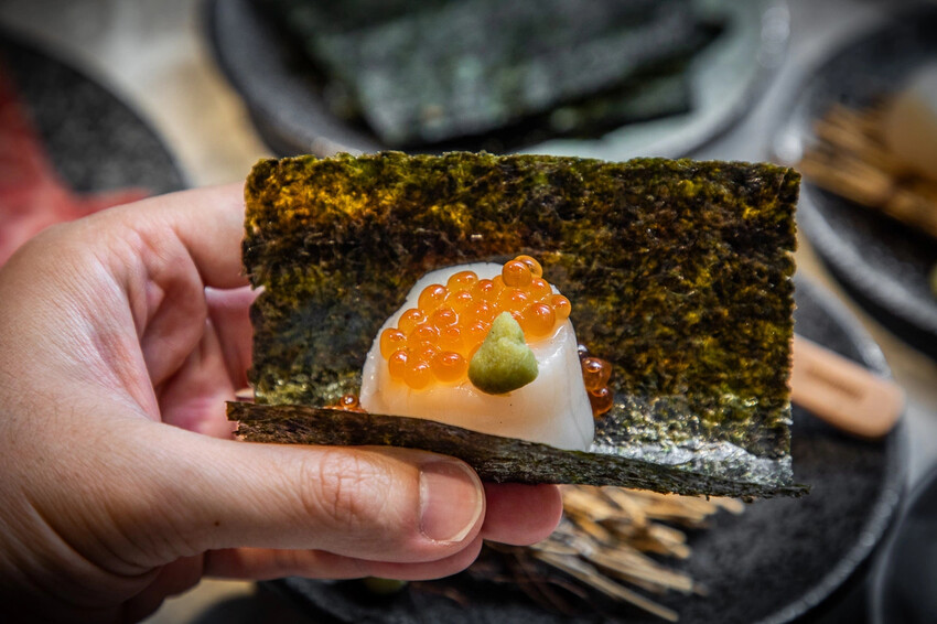 吃肉肉燒肉専門店(竹北店)的海鮮也是厲害到一個離譜!首推就是這個生食級干貝佐鮭魚卵,可以用海苔包著干貝跟鮭魚卵一起吃,入口海味鮮味大噴發,這個也是吃到飽啦,超屌!