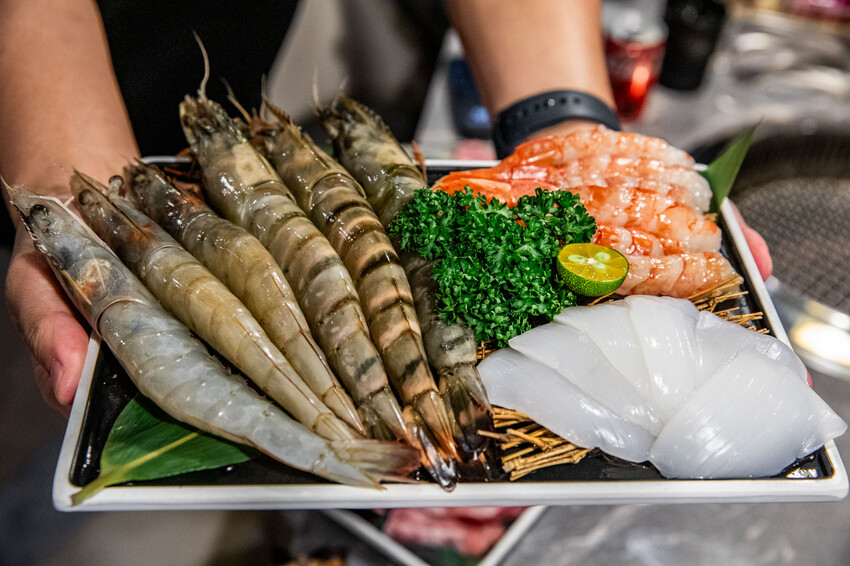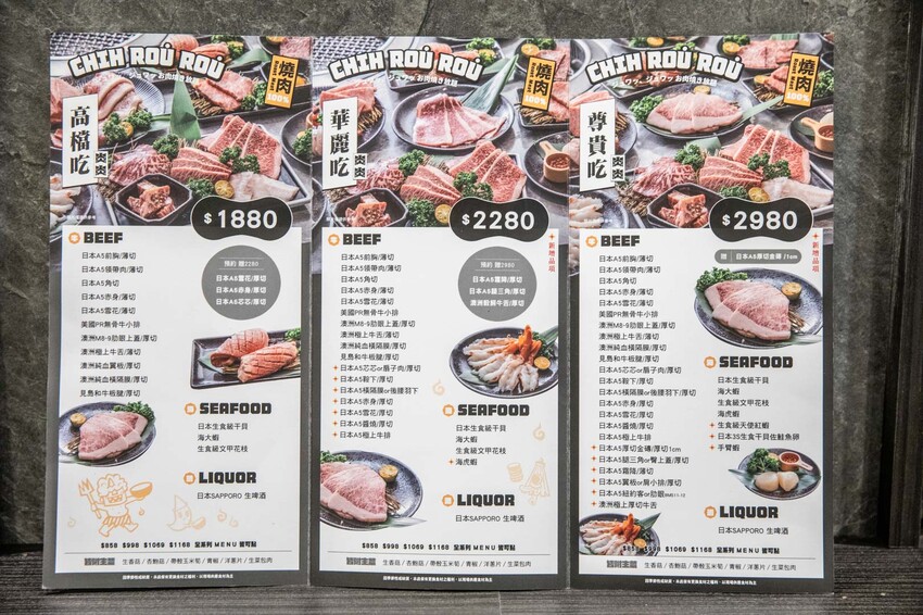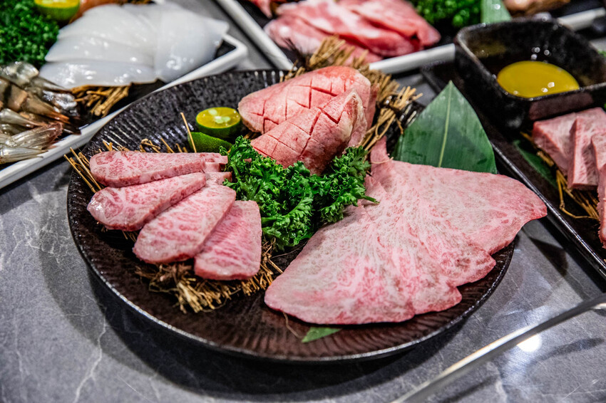 吃肉肉燒肉専門店提供兩種吃到飽選擇:一般常態菜單和和牛吃到飽。我強烈建議直上和牛吃到飽,和牛吃到飽有三種價位:$1880、$2280和$2980,若追求極致享受,$2980的選擇是最佳,店內的頂級A5等級和牛有薄切和厚切多種選擇,此外還有生食級超大干貝、天使紅蝦、紋甲花枝等珍饈海鮮,這裡的和牛質量極佳,基本上吃上四到五盤厚切和牛便能值回票價,但和牛需要提前準備,所以要提前預約唷