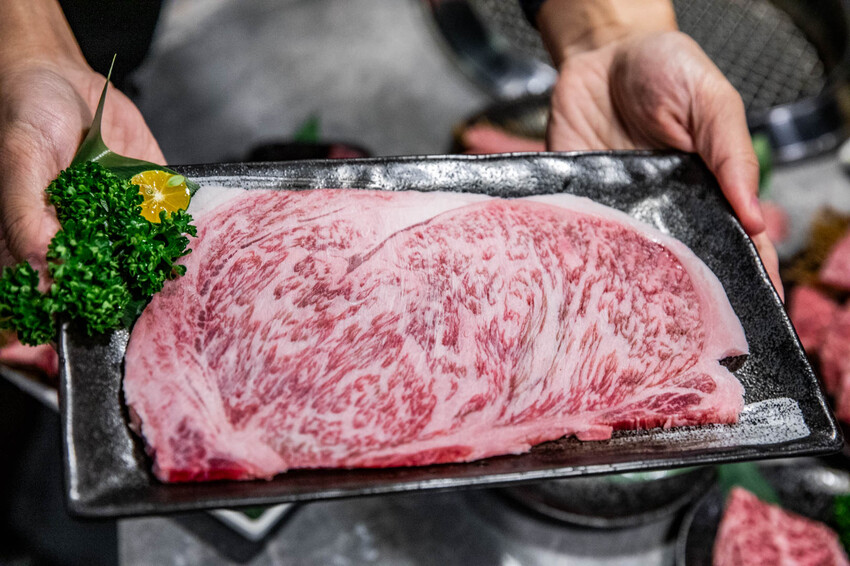 日本A5牛排,嫩度來自於豐富油花,分布得像大理石一樣均勻,這塊是芯芯肉的部位,吃起來會比一般A5和牛要稍微多點肉感,非常好吃
