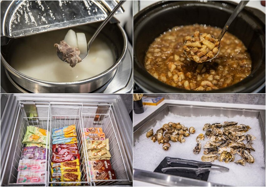 吃肉肉燒肉専門店提供單點式燒烤吃到飽,然而它也設有一個自助吧區域。飲料的種類繁多,令人眼花繚亂,整區的各式飲料更是令人驚喜,白飯與各式醬料,還有美味的蘿蔔湯和滷肉皆是無限量供應,甚至還有法國海螺和新鮮的牡蠣,然而吃肉肉的菜單實在是太出色了,以至於我僅僅在自助區拿了些醬料和白飯,至於飲料,我完全沒動手,稍後再告訴你為什麼?