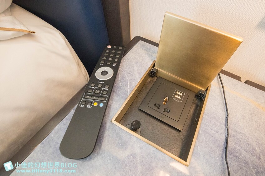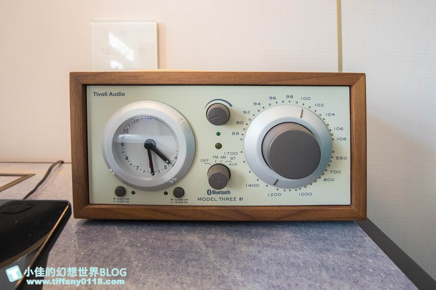 床頭有 Tivoli Audio 藍牙鬧鐘收音機音響,可以連自己的手機播放音樂,另外還有控制房間所有電燈的開關也設在床頭,想充電的話也有三孔插座跟USB孔。
