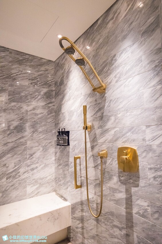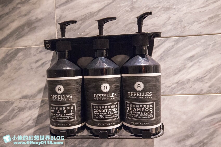 淋浴間還有個小鏡子我第一次見到,而且還有大理石椅可以坐,對於老人家或小朋友來說這設計很棒。沐浴用品是澳洲「APPELLES」的沐浴乳、洗髮乳、護髮素,味道滿舒服的。